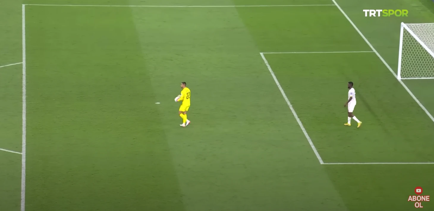 Плюс просто идеальная подача – на удобной высоте для соперника, мяч неудобно падает прямо перед вратарем. Что тут мог сделать Менди? Почувствовать по ходу полета мяча, что не добирается, притормозить и попробовать раскрыться – в смысле, расставить руки, перекрыть как можно большую площадь и пытаться как-то пальцами отбить. Даже скорее рассчитывать, что в него попадет.
