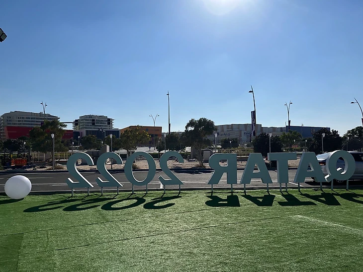 Где-то через 20 минут после выхода из метро мы возле деревни. Встречает надпись Qatar 2022. На заднем фоне – тот самый торговый центр.