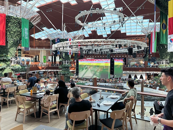 Здесь огромный торговый центр Mall of Qatar с магазинами, гигантским фудкортом, обменом валюты, кинотеатром и вообще всем необходимым. Днем здесь смотрят футбол на огромном кубе в центре фудкорта.