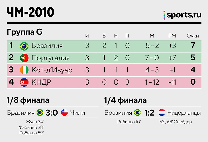 На ЧМ-2010 все тоже работало: обыграли КНДР (2:1) и Кот-д’Ивуар (3:1), а с Португалией (0:0) скатали прагматичную ничью. Снова первое место в группе! Дунга шел вперед назло критикам, а дальше снес Чили (3:0) в 1/8 финала.