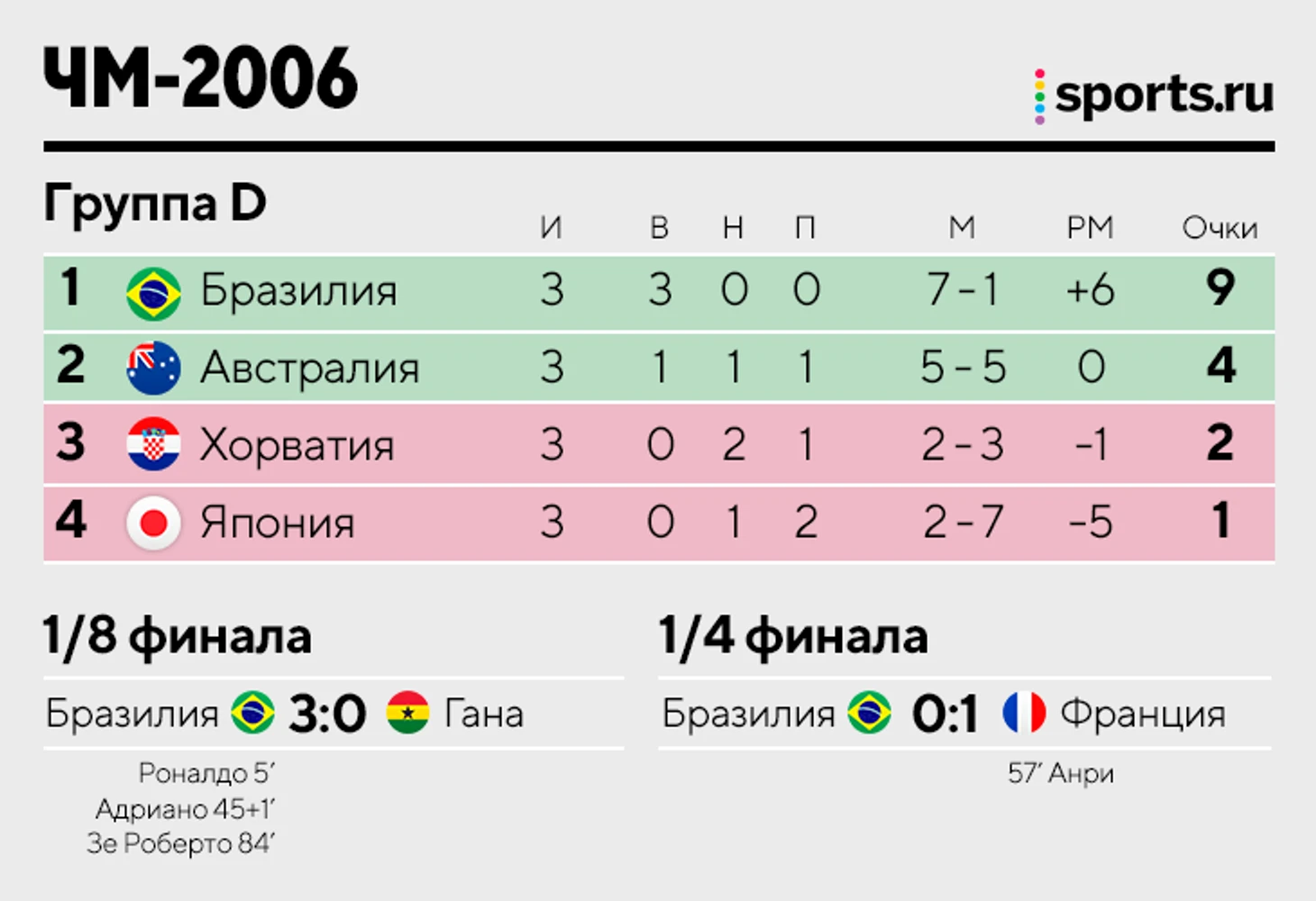 Вот только ничего не вышло: бразильцы с Францией лупили мимо и не создали толком ни одного момента, а Анри их наказал за несогласованную попытку создать искусственный офсайд на одном из стандартов (почти вся команда осталась на линии штрафной, но трое идею не поддержали).