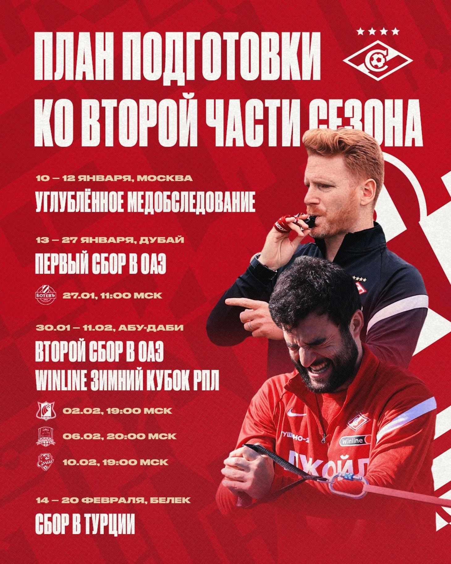 В Абу-Даби красно-белые примут участие в товарищеском турнире Winline Зимний кубок РПЛ. 2 февраля «Спартак» сыграет с «Ростовом», 6-го — с «Краснодаром», а 10-го — с «Сочи».