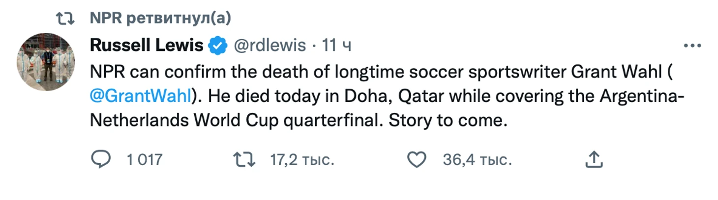 Американский журналист Грант Валь скончался во время освещения четвертьфинала ЧМ Аргентина – Нидерланды. Репортер американского Национального общественного радио (NPR) Рассел Льюис сообщил об этом в Твиттере: