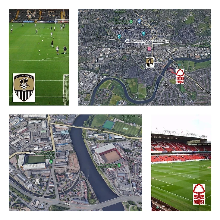 Стадионы обоих ноттингемских клубов находятся на расстоянии 300 ярдов или 275 метров друг от друга, через реку Тренд, протекающую через город. «Сити Граунд», стадион Ноттингем Форест, построен еще в 19 веке, пережил несколько реконструкций, но сохранил свой исторический шарм, сегодня он вмещает 30 тысяч зрителей 52°56'24.0"N 1°07'58.0"W – Google Карты. Ноттс Каунти играет «Медоу Лейн», это не менее атмосферная арена на 20-ть тысяч болельщиков. 52°56'33.0"N 1°08'14.0"W – Google Карты. Рассмотрите карты – очень интересный вид!