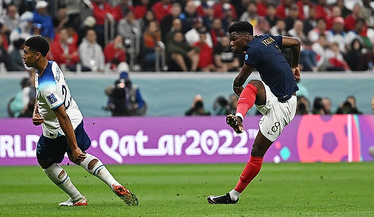 В сторону Франции этот матч повернул Орельен Тчуамени – он бахнул из-за штрафной вторым касанием, из неочевидной позиции. Но попал в угол, а Джордан Пикфорд не дотянулся.