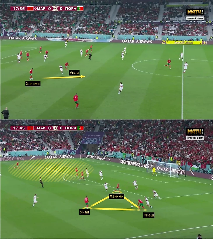 Буфаль и Зиеш – отличные дриблеры, но особенно впечатлило взаимодействие вингеров с Хакими и Унаи. Ашраф подключался не только по флангу, но и заходил в середину, и хорошо откликался на передачи марокканской восьмерки – это было очень технично и быстро.