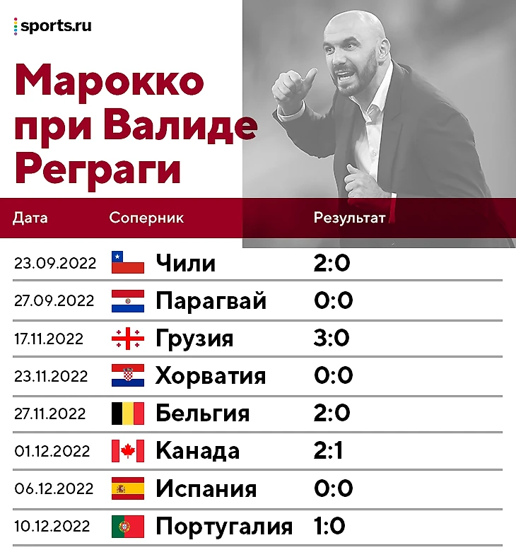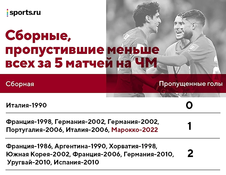 Выступление Марокко на ЧМ в Катаре уникально. Команда Реграри – шестая сборная в истории, пропустившая всего 1 гол за 5 матчей. Успешнее только Италия-1990 под руководством Адзельо Вичини – ее впервые огорчили только в полуфинале.