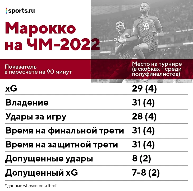 Реграги выстроил мощную оборону для турнира с короткой дистанцией. Марокко комфортно себя чувствует при 0:0, африканцам еще не приходилось отыгрываться и оставлять пространство за спинами. Сборная все же оверперформит (4,7 xGA), хотя из оставшихся команд меньше допускает только Аргентина.