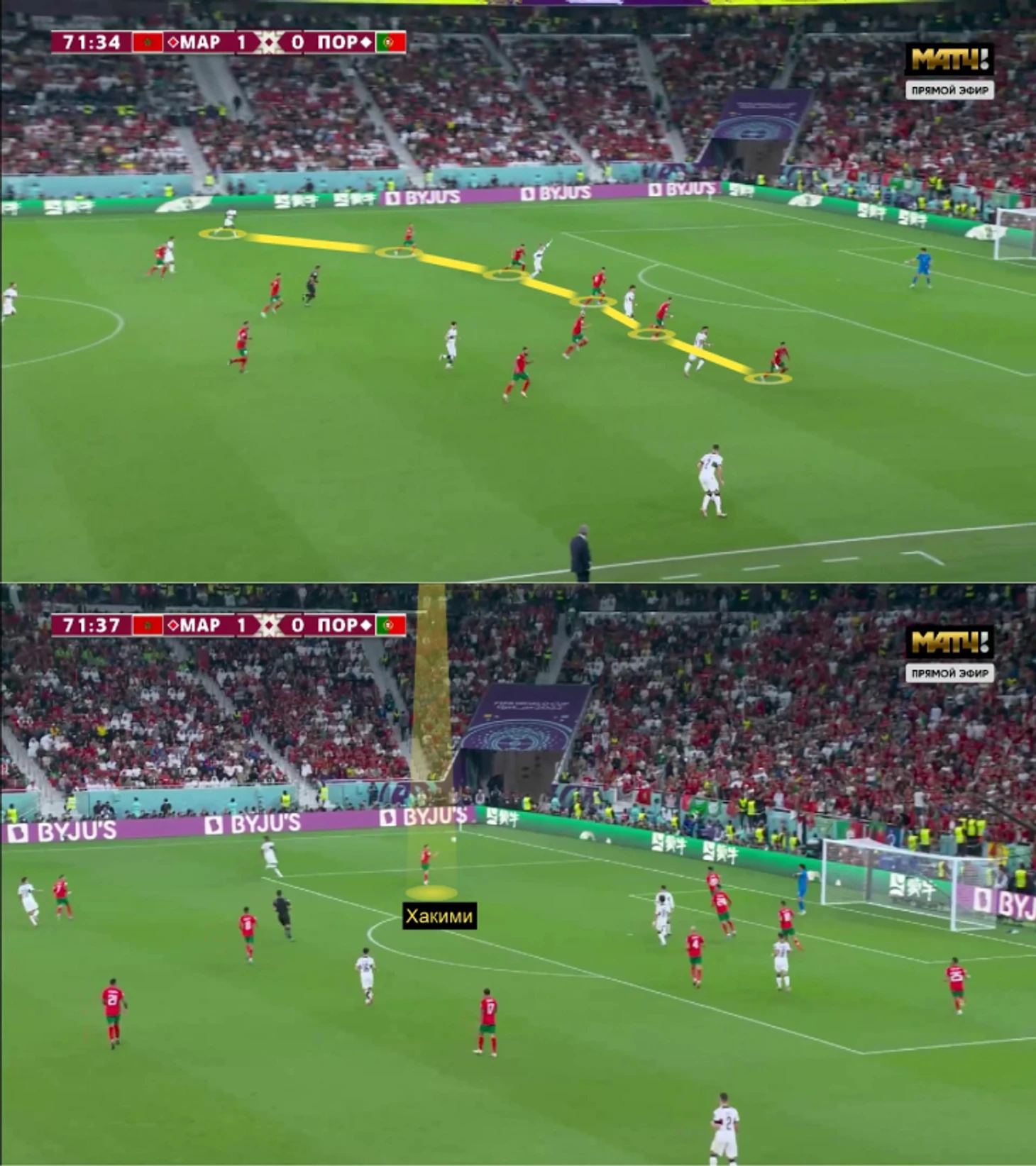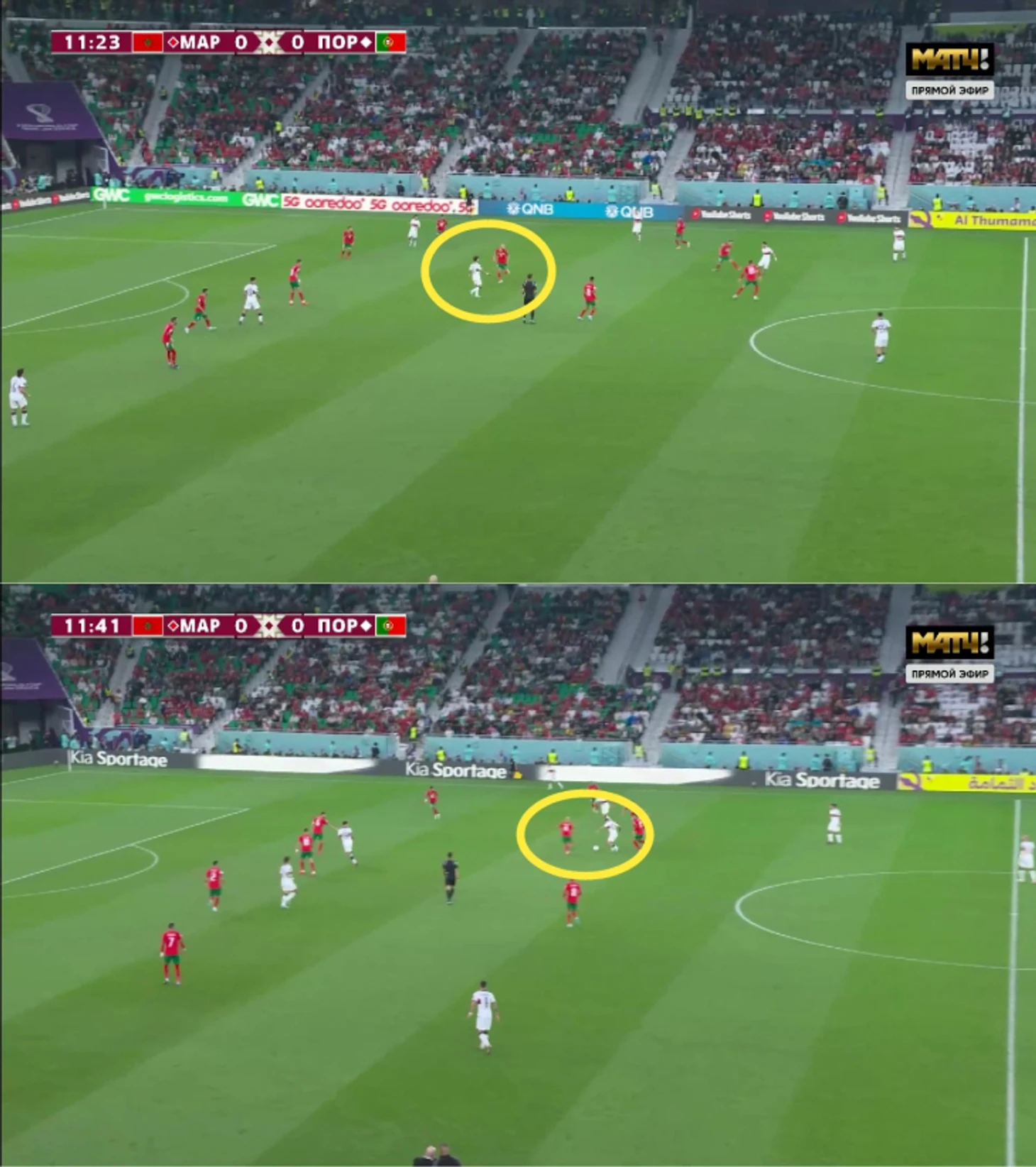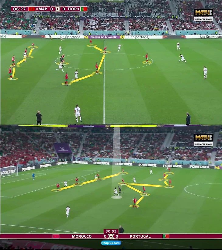В первом тайме марокканцы перебили Португалию: вели 7:5 по ударам (5:3 – из штрафной) и активно угрожали в контратаках. Марокко быстро выбиралось вперед в разных ситуациях: вылетали в быстрые прорывы после диагоналей и выходили через короткий пас под прессингом Португалии. Первый вариант подходил для мобильных марокканцев – атакующая структура команды Сантуша слишком плавающая, поэтому африканцы стабильно находили пространство.