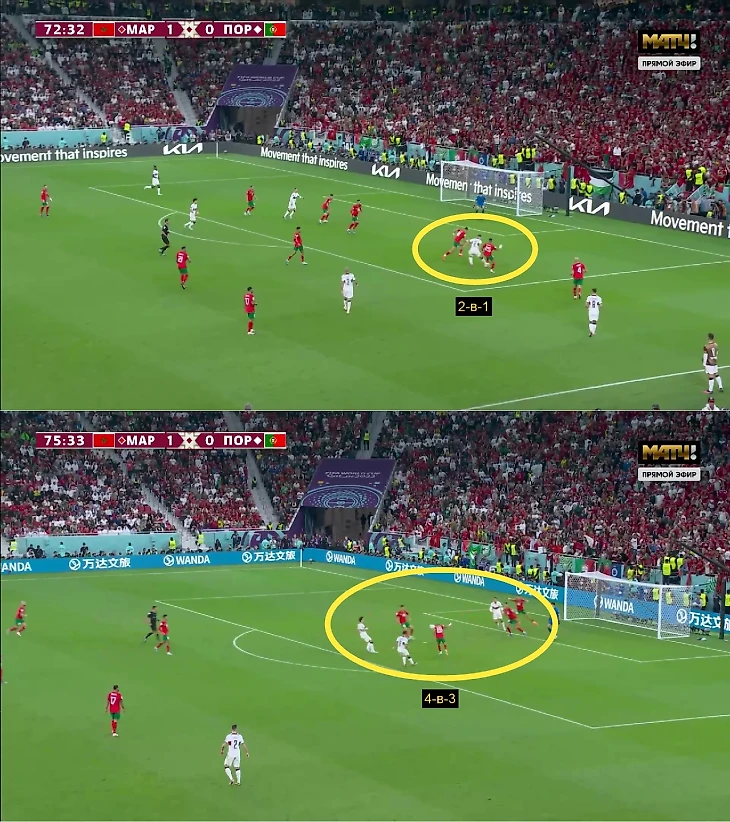 После систематического перехода на 5 защитников для Марокко упростился контроль флангов и штрафной (ушло гибридное распределение ролей), а 2 удара Португалии с игры после 65-й минуты – результат дальних попыток (сделали всего 9 касаний в штрафной, 1 – безуспешное, 2 – отборы). При этом команда Сантуша все же выжала топ-момент – Пепе опасно пробил с линии вратарской.