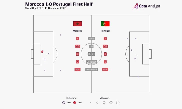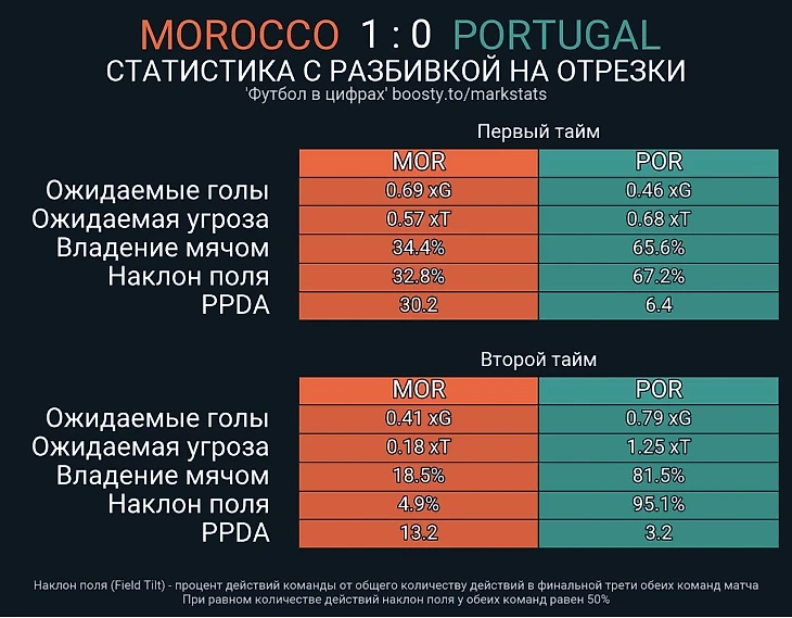 В первом тайме Марокко сыграло на равных с Португалией. Благодаря голевой атаке африканцы выбили больше ожидаемых голов (0,8-0,3), но количество подходов совпадало: Феликс дважды опасно бил по воротам (плюс Бруну попал в перекладину), а Аттийят-алла сначала классно выкатил на Амаллу, а затем опасно подключился в конце тайма.