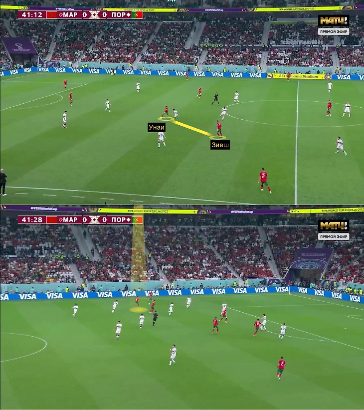 За минуту они дважды разогнали хорошую атаку. Второй случай закончился ударом Зиеша, хотя были варианты получше, но игра Унаи и Хакими – топ. Сначала они разыграли стенку против Отавио (первый скрин), а затем треугольник органично расположился справа у штрафной португальцев: Хакими был выше всех, Унаи – чуть глубже, а Зиеш поддерживал ширину (второй скрин).