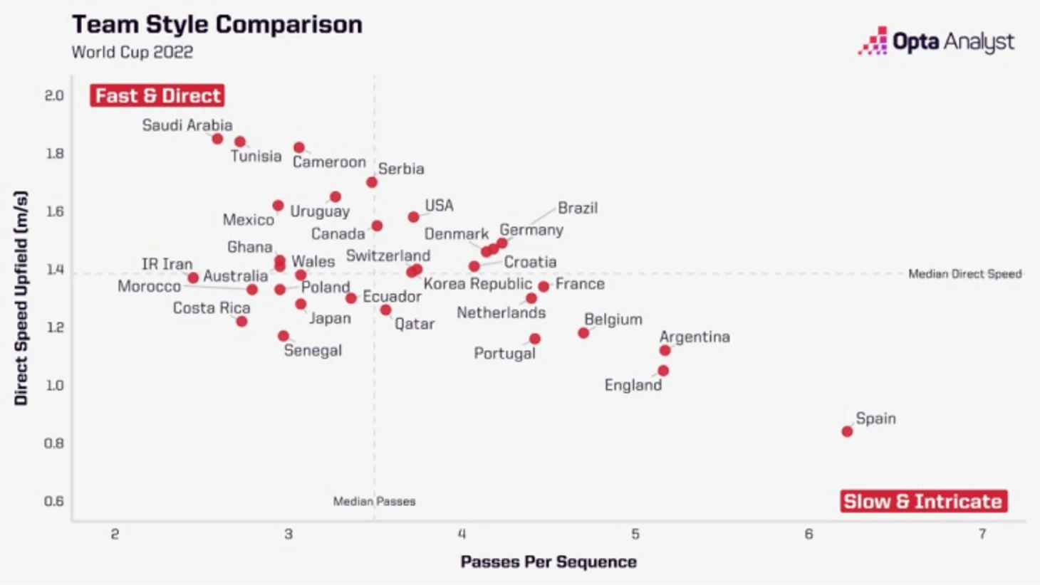 Ниже – график от Opta, где вертикальная ось – это скорость продвижения, а горизонтальная – количество передач. Марокко быстро двигает мяч, но это нельзя назвать примитивным футболом с постоянными забросами. Африканская команда умеет играть коротко и обладает классными инструментами: Хакими и Мазруаи – защитники из топ-клубов, Зиеш и Буфаль – сильные и скоростные дриблеры, а полузащитники интересно подключаются вперед (было видно против Португалии).