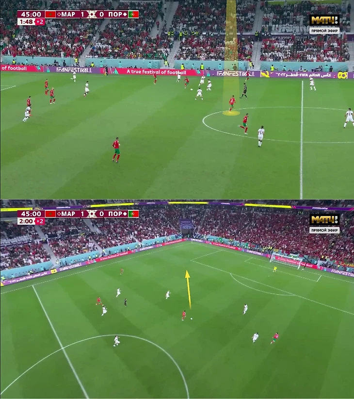 План на Португалию немного отличался от матча с Испанией. Реграги сохранил схему и принципы, но уже был не так помешан на компактности (идея вернется во втором тайме). В ⅛ защитники и хавбеки оставляли минимальный зазор между линиями, чтобы испанцы не комбинировали в середине, а Эн-Несири играл по Бускетсу. Марокко заблокировало все варианты в центре, успешно перестраивалось на флангах и легко пользовалось стерильным контролем. С Португалией старт был иным: Марокко оставляло гораздо больше пространства, но это почти не ощущалось из-за явной ставки команды Сантуша на забросы и диагонали. В теории фишка со свободными зонами могла сработать – именно из-за этой конфигурации опасно пробивал Феликс.