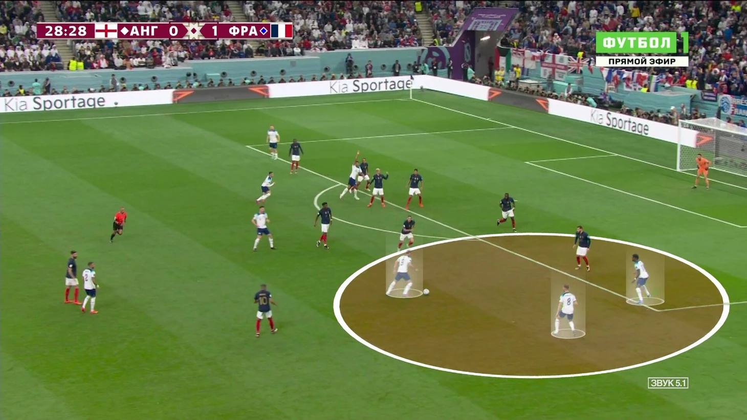 Саутгейт разменял его на Мбаппе (Уокер не подключался), а дальше активно нагружал именно эту уязвимую зону. Букайо Сака стартовал в широкой позиции, рывками из центра полузащиты его всегда поддерживал Джордан Хендерсон. Частыми были ситуации, где эта парочка оказывалась на пространстве против Эрнандеса и Рабьо: