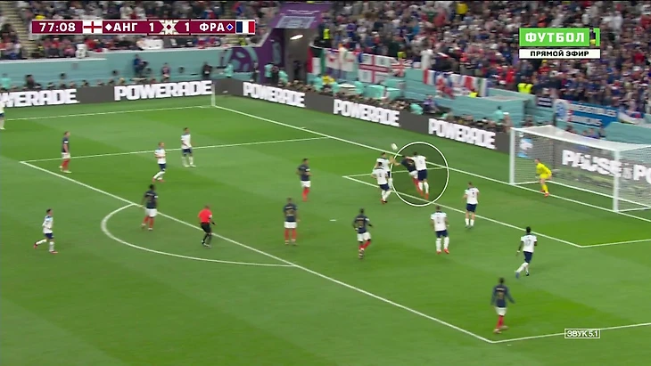 Франция сделала 7 подач с игры. В пяти из них мяч долетал до французского игрока. 4 ситуации завершились ударами. Из двух английских удачных попыток отбиться одна завершилась подбором и второй волной, в которой была успешная подача. Это невероятный уровень паники при кроссах.