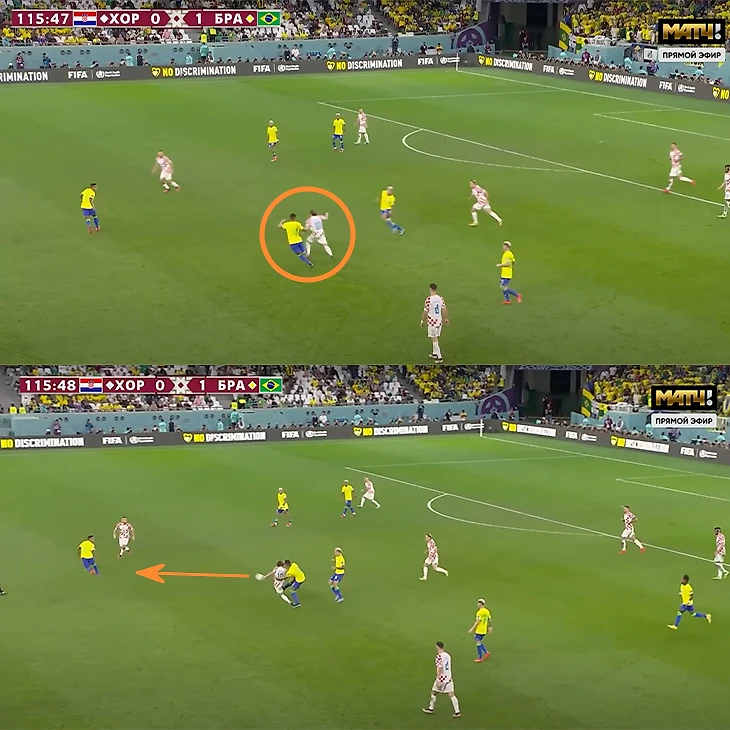 После 115 минут изнурительной борьбы он получает неидеальный пас с отскоком от газона, тут же попадает под прессинг Каземиро (!), легким движением корпуса отклеивается от одного из лучших опорников мира и выкатывает мяч на Влашича.