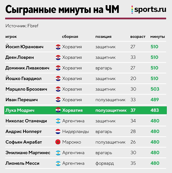 В 37 лет (извините, придется упоминать это часто) Модрич врывается в топ ЧМ по количеству сыгранных минут. Да, у хорватов было два матча с овертаймами и забрались они максимально далеко. Но все же давайте зафиксируем.