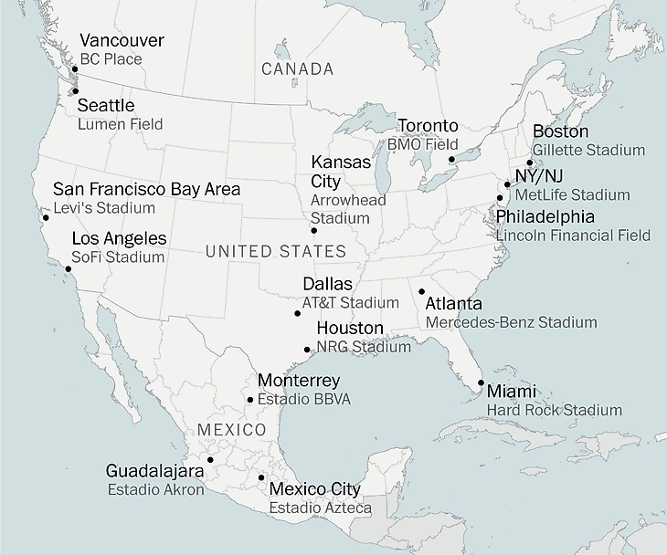 Вот список городов и стадионов, которые будут принимать Чемпионат Мира 2026, который пройдёт в США, Канаде и Мексике.