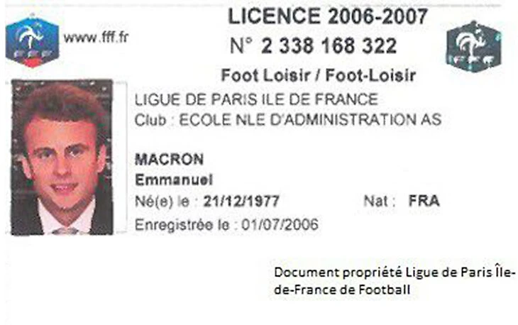 В юном возрасте Макрон бегал на позиции левого защитника в команде Национальной школы администрации. После победы Макрона на президентских выборах в 2017-м, в соцсетях активно распространяли фото его лицензии футболиста на сезон-2006/07.