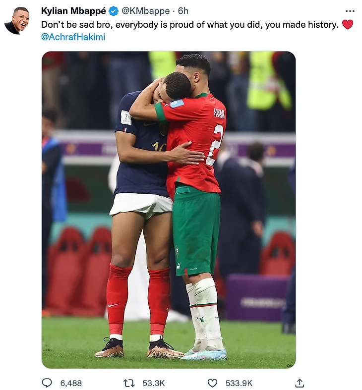 «Не грусти, братан, все гордятся тем, что ты сделал, ты вошел в историю», – написал Килиан Мбаппе в Твиттере после матча Франция – Марокко. Таким образом француз выразил поддержку Ашрафу Хакими, который является его партнером по «ПСЖ».