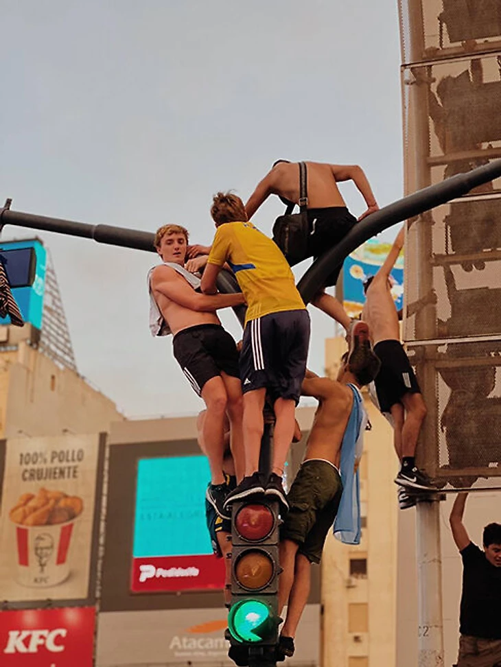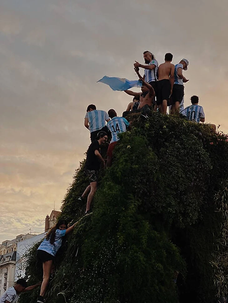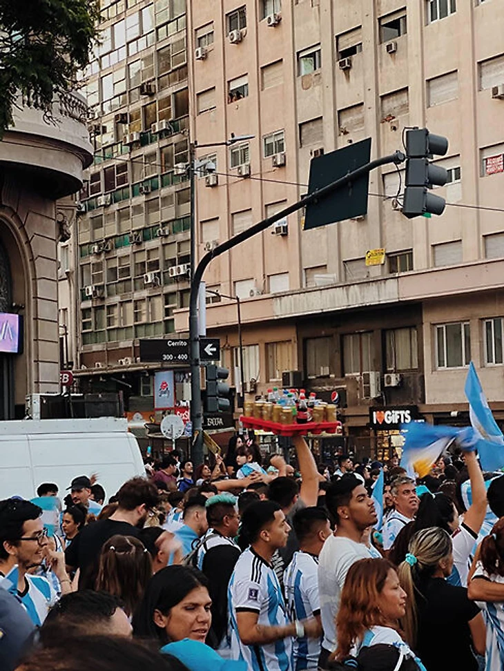 Аргентина победила 3:0. Оркестр, который играл у бара, начал двигаться вдоль улицы. Люди вставали на крыши машин, на киоски, на светофоры. Задача аргентинца после победы – занять как можно более высокую позицию. Для чего – непонятно. Но если есть точка выше земли хотя бы на полметра, там точно кто-то будет стоять.