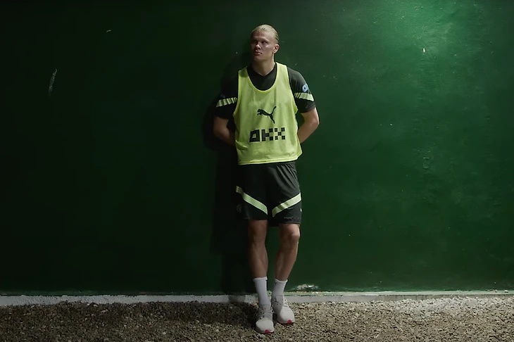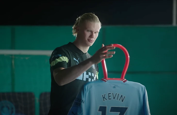 «Но время летит. Не буду врать – скучаю по всем шуткам», – говорит Холанд. В этот момент норвежец бережно надевает на манекен футболку Кевина де Брюйне – главного партнера по атаке.