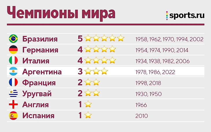 • Сборная Аргентины – четвертая в истории, у кого есть минимум три чемпионских титула. Когда мы только узнали, каким будет финал, стало ясно, что у нас появится новый трехкратный чемпион, в итоге это именно аргентинцы. У них уже через четыре года появится шанс влететь в топ-3, потому что до Испании и Германии остался всего один трофей.