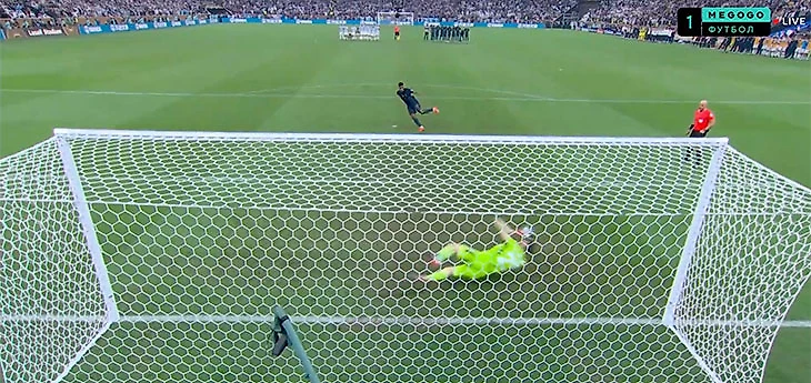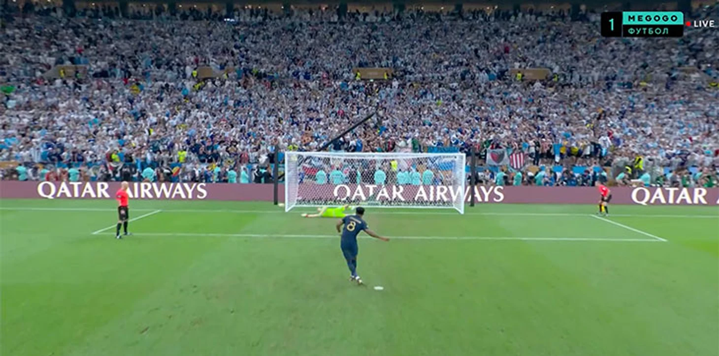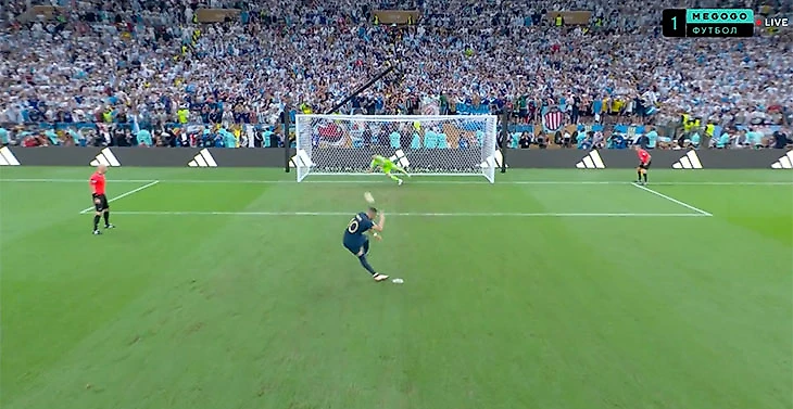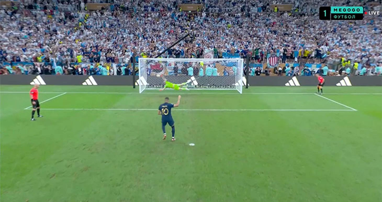Первым решился бить Килиан Мбаппе. В левый угол – Эмилиано Мартинес угадал и поооочти достал.