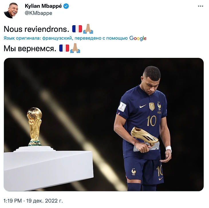 В воскресенье Килиан Мбаппе сделал хет-трик в финале чемпионата мира, но даже это не помогло забрать золотую медаль. Француз ушел с серебряной, но в понедельник заявил: «Мы вернемся».
