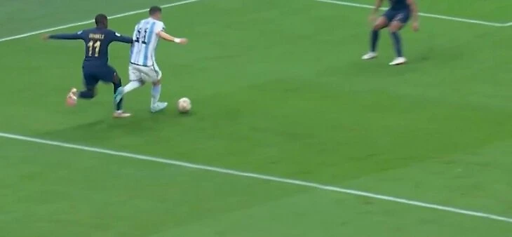 Тот случай, когда защищающийся ответственен за движение сзади: он не должен пересекать движение соперника. К тому же аргентинец двигался с мячом к воротам, а Дембеле находился позади него.