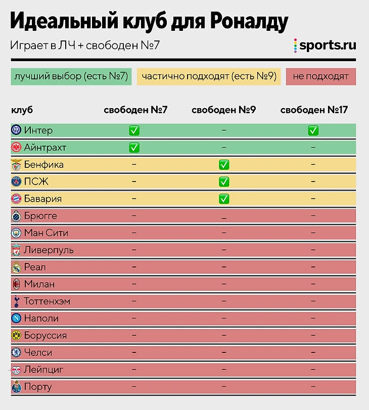 Давайте взглянем на ситуацию под другим углом и выберем клуб, который соответствует еще одному важному критерию – в нем свободен любимый номер Роналду. Дисклеймер – не воспринимайте этот пост как серьезную аналитику.