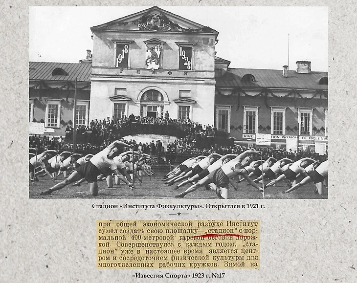 «Достаточно указать на то, что в самое трудное время, при общей экономической разрухе Институт сумел создать свою площадку – «стадион» с нормальной 400-метровой гаревой беговой дорожкой. Совершенствуясь с каждым годом, «стадион» уже в настоящее время является центром и сосредоточением физической культуры для многочисленных рабочих кружков».