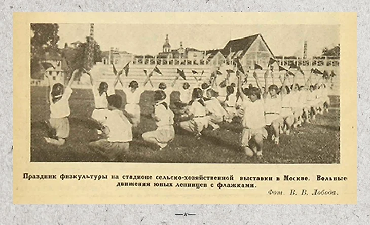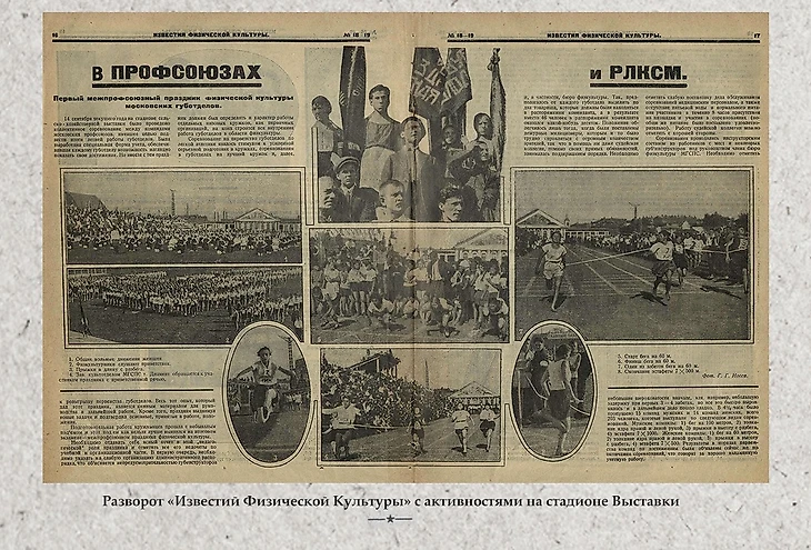 Выставочный стадион же предназначался в первую очередь для зрителей – то есть зрелище стало играть здесь ключевую роль. Читаем в альманахе Выставки: «Физическая культура – будет также представлена на выставке. Наилучшим сопровождением выставочных экспонатов по физкультуре и спорту будет несомненно Всесоюзный праздник физкультуры, приуроченный к выставке – этот всесоюзный смотр красных фаланг молодости, здоровья и силы». Здесь открытым текстом говорится о предназначении нового спортивного объекта – «смотр» предполагает большое зрелище. Таким образом, площадка для игры в футбол, не просто обросла с двух сторон трибунами, но и обрела новую функцию – места для показательных выступлений, зрелища, шоу.