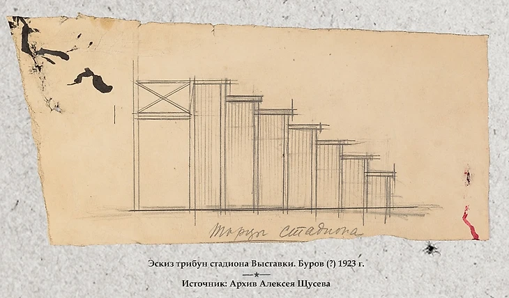 Проектом Иностранного отдела выставки занимался небезызвестный архитектор В. Щуко. Но проектировку стадиона отдали на откуп молодому студенту ВХУТЕМАСа Андрею Бурову. Задание, нужно сказать, было весьма ответственное, хоть и не подразумевало каких-то сверхвычурных архитектурных решений – стадион должен был стать центральным ядром всего Иностранного отдела выставки.