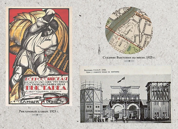 На несколько лет арена получила статус «Центрального Стадиона», а значит именно здесь проходили главные физкультурно-спортивные мероприятия столицы. Так, например, во время функционирования Выставки в 1923 г. именно на этой поляне прошел первый в истории финал Чемпионата СССР по футболу. И пусть сам матч получился весьма куцым в смысле футбола (подробнее об этом мы рассказывали здесь), но сам статус матча подчеркивал особое значение новой арены для столицы.