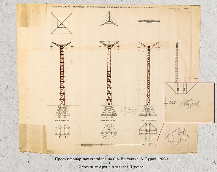 На тот момент Буров еще не звезда советского авангарда, не тусуется с Ле Корбюзье и Эйзенштейном, а пока что набирается опыта на архитектурном факультете в мастерской А.А. Веснина. Однако он уже активно ведет творческо-архитектурную деятельность, в частности, участвует в конкурсе проектов упомянутой выше Выставки, и получает третью премию. Авторству Бурова принадлежат несколько павильонов на выставке, стадион и проекты фонарных столбов, на которые обратим отдельное внимание далее.