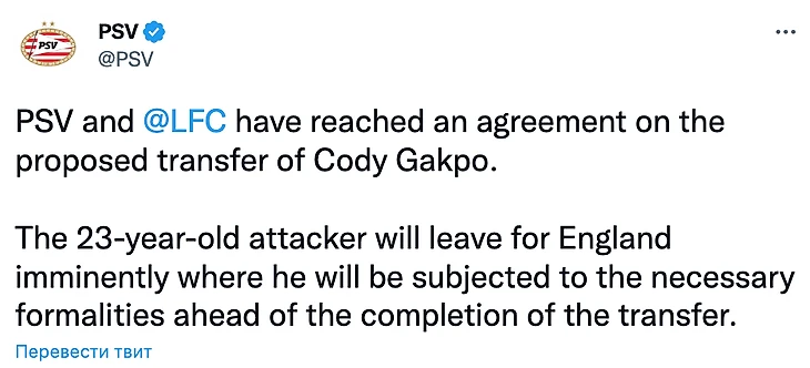 27 декабря, 00:57 по Москве: ПСВ объявляет о договоренности с «Ливерпулем».
