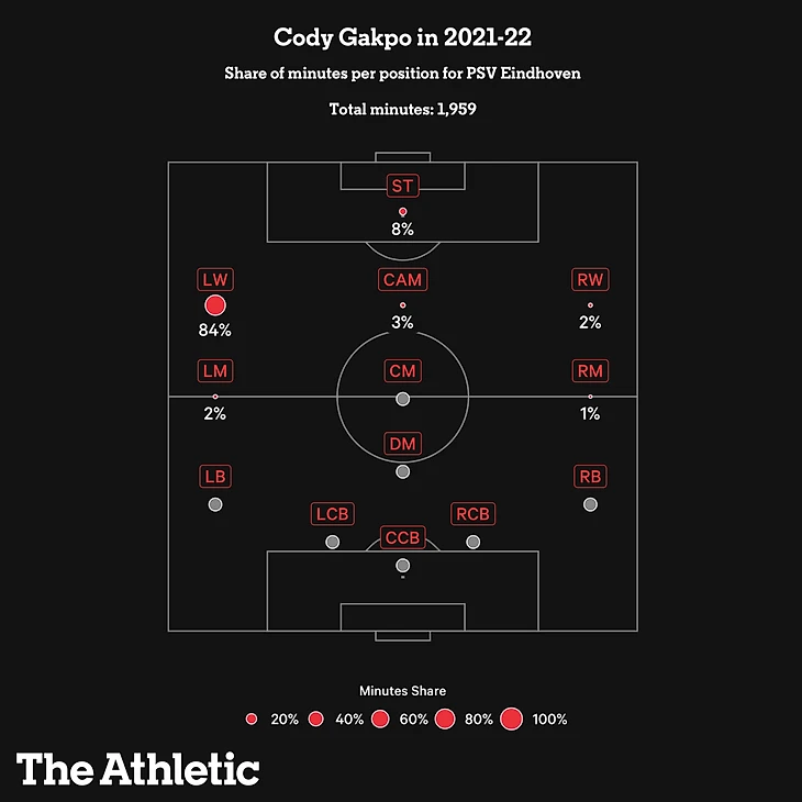 Кстати об этом, Гакпо почти всегда играет на левом фланге ПСВ в схеме 4-2-3-1 или 4-3-3 под руководством главного тренера Рууда ван Нистелроя, как показано в его профиле ниже за прошлый сезон.