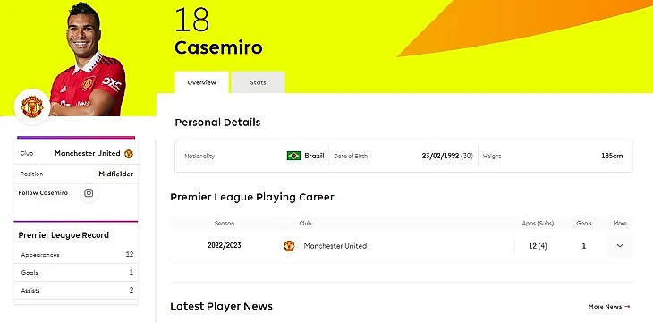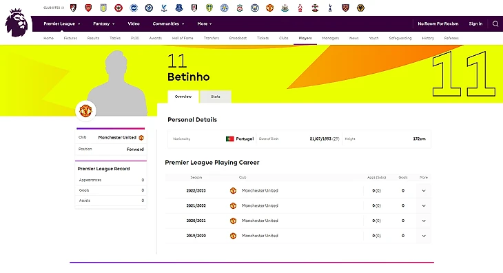 2. В профиле Бетинью на сайте АПЛ указаны и предыдущие сезоны, которые он якобы провел в «Юнайтед» – у новичков же только текущий. Вот, например, Каземиро.