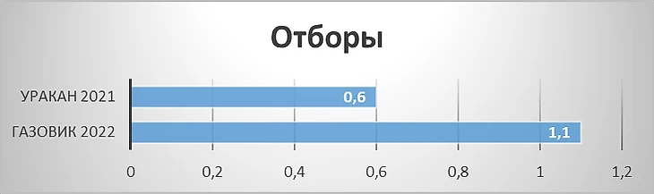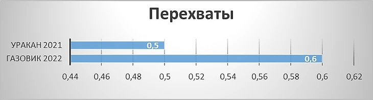 Сравнение идет по показателям выборки из 35 цп РПЛ в процентном соотношении. Если по шкале «дриблинг» показатель игрока 0,9, то это значит, что игрок лучше чем 90% футболистов. Как видно из графика игрок находиться в нижнем диапазоне в графе *отборы* - 1,1 за матч, что меньше, чем у подавляющего большинства, но с неплохим процентом 73,33. Ниже представлю графики, где видно, что игрок улучшил эти показатели в Оренбурге