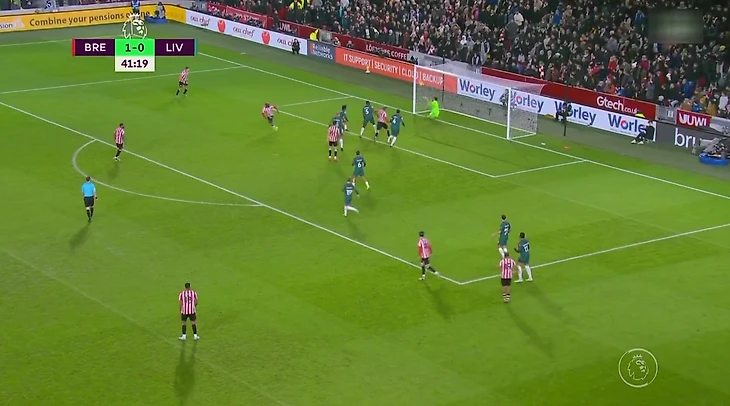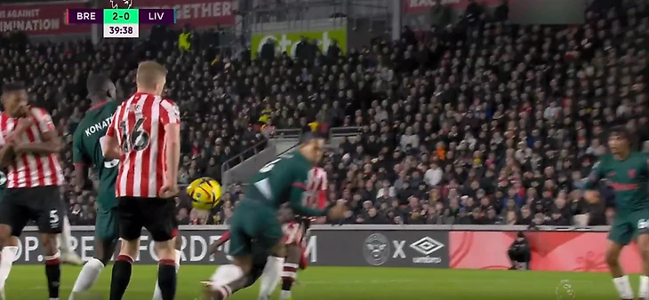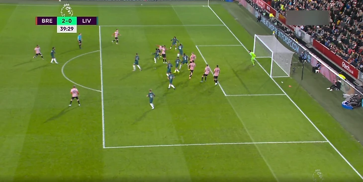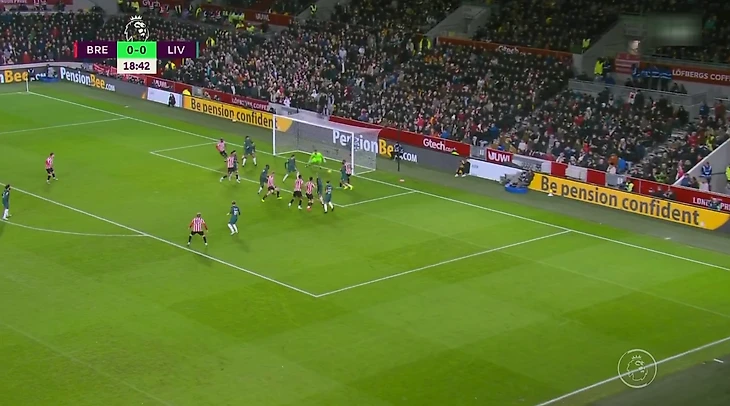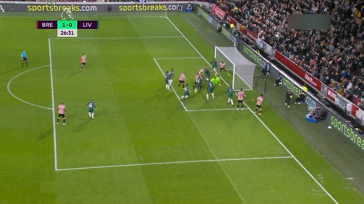 Второй мяч на 27 минуте был забит с нарушением правил. «Брентфорд» опять подал угловой, Алиссон отразил пару ударов, но один не смог. Участвовавший в добивании игрок находился в офсайде.