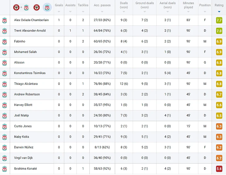 Окслейд-Чемберлен − лучший, Конате − худший. Оценки игроков «Ливерпуля» после матча с «Брентфордом»