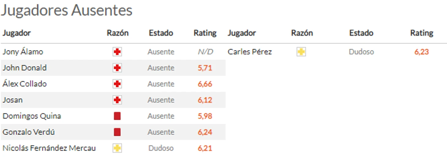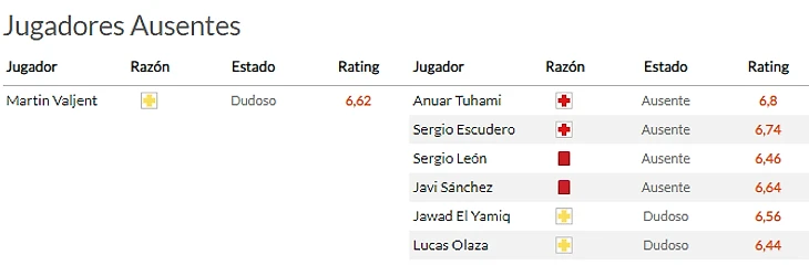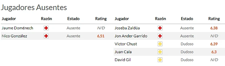 Кстати о них. Под вопросом появление на поле поврежденных Иньиго Мартинеса(6) и Капы(5,5), а у гостей пропускают матч дисквалифицированный Унай Гарсия(5), травмированный Начо Видаль(5,5) а возможно Рубен Пенья(5,5), который вчера не смог закончить кубковый матч из-за повреждения