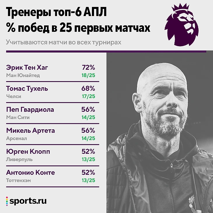 Высокий (и лучший в топ-6) процент побед на старте – комплимент работе Тен Хага и потенциально один из маркеров ее оценки в будущем, но точно не инструмент для сравнения с другими тренерами. Кто-то начал работу в более слабых кадровых условиях, кто-то – на более сложном отрезке сезона. Важно сохранить победный темп в ближайшие месяцы – все самые сложные матчи еще впереди.
