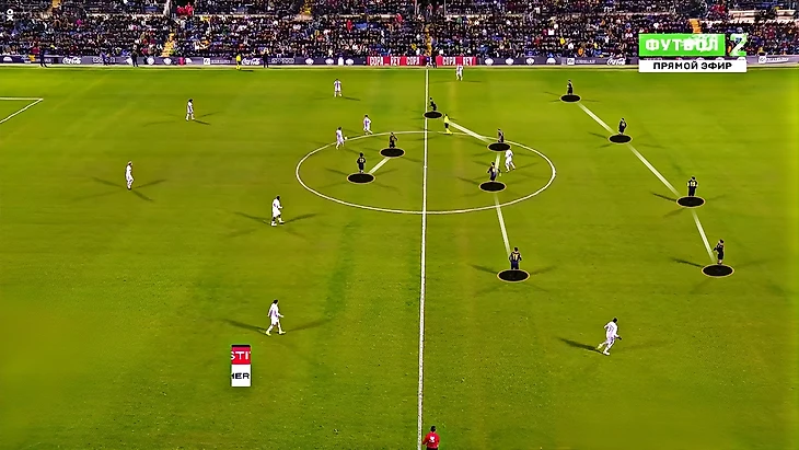 Однако это исключение из правил – больше «Барса» не позволяла сделать такое сопернику (голы хозяев пришли из другого типа эпизодов). Тенденция в первом тайме была скорее обратная – тотальное ограничение соперника за счёт численного преимущества сзади в моменты редких атак «Интерсити»: