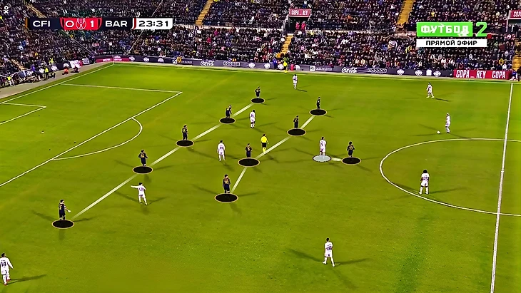 Один из приёмов, который использовали хозяева, чтобы ограничить «Барселону» – опускания Мигеля Санчеса к Кристо Ромеро, чтобы организовывать численное большинство против Усмана Дембеле, и не оставлять французского вингера в изоляции против защитника. Этот приём уже использовал против «Барселоны» оригинальный «Интер» – миланский. Тогда Генрих Мхитарян здорово отпахал, помогая Федерико Димарко против Дембеле.