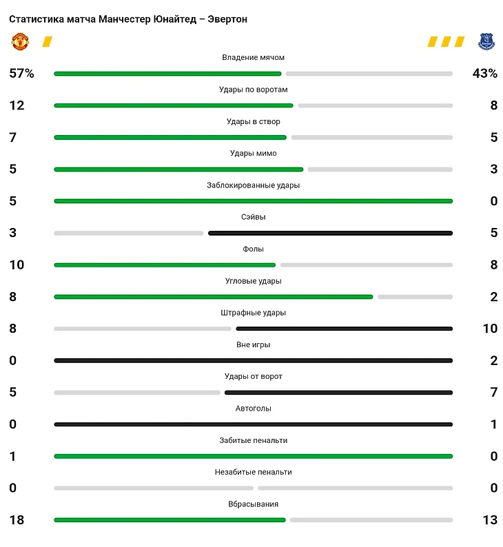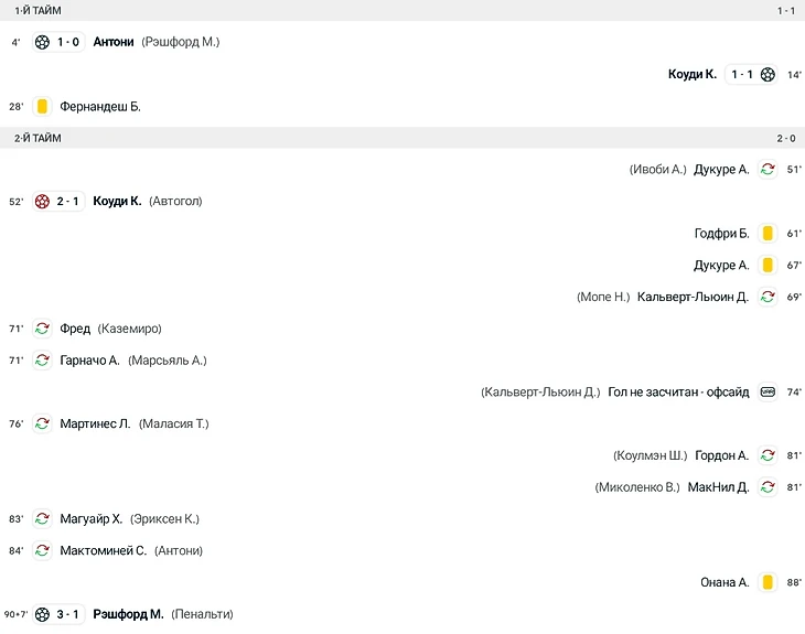 Манчестер красиво разобрал Эвертон по полочкам. Раньше перед началом матча МЮ однозначно считался бы фаворитом, но к сожалению времена Фергюсона прошли и к началу этого матча команды подходили с равными шансами на победу. Тем не менее манкунианцы начали довольно бодро и уже на 4-й минуте Рэшфорд покатил на дальнюю, а Антони замкнул в пустые. Не долго музыка играла, на 14-й минуте Де Хеа каким то нелепым образом поймал мяч в домик, а Коуди замкнул в пустые. Ну а дальше начался бенефис дьяволов и довольно грубая игра ирисок. Голов пришлось ждать до 52-й минуты, забил Эвертон, и вновь отличился Коуди, правда не в те ворота, МЮ повёл. На 74-й минуте Эвертон сравнял, но гол был отменен из-за оффсайда. МЮ уверенно довёл дело до победы, а Маркус Рэшфорд на 90+7 минуте забил с пенальти доведя счёт до крупного. Итог 3-1 в пользу МЮ, уверенная и яркая игра дьяволов, которая вселяет надежду на скорое возвращение на пьедестал.