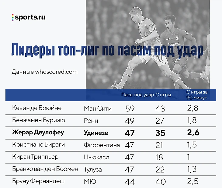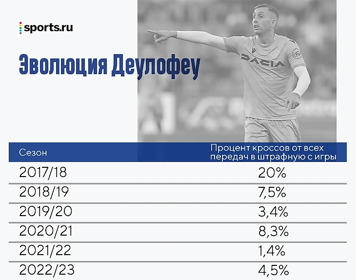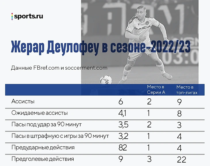 Деулофеу – исключение. Он идет вторым ассистентом Серии А после Милинковича-Савича, лидирует по ожидаемым ассистам и передачам в штрафную, уступает одному Лорьянте по пасам под удар и держится третьим по предголевым действиям. Жерар организовал 173 из 223 ударов «Удинезе».