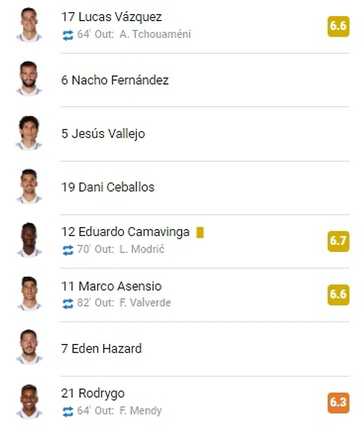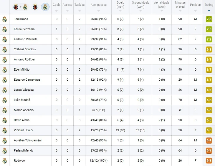 По версии SofaScore, Ферлан Менди, допустивший первый гол, получил наихудшую оценку, как и Родриго, заменивший его на 64-й минуте. Карим Бензема и Тони Кросс, напротив, получили лучшие баллы.